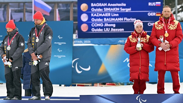 During the medal presentation on Wednesday, German silver medallist Linn Kazmaier and her guide, Florian Baumann, averted their eyes as the Russian flag was hoisted and the anthem played.