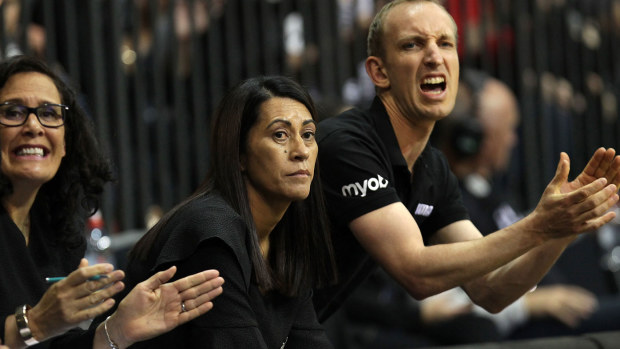 Noeline Taurua (centre) observing the Silver Ferns during a match. AAP