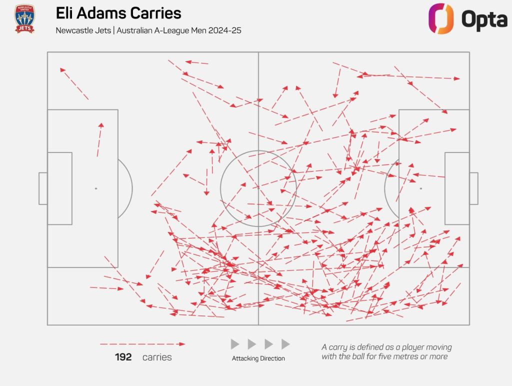 Adams has achieved a personal best this season, scoring seven goals in 19 appearances and accumulating 1,558 minutes on the pitch. He currently shares the title of Newcastle’s top scorer with Lachie Rose.