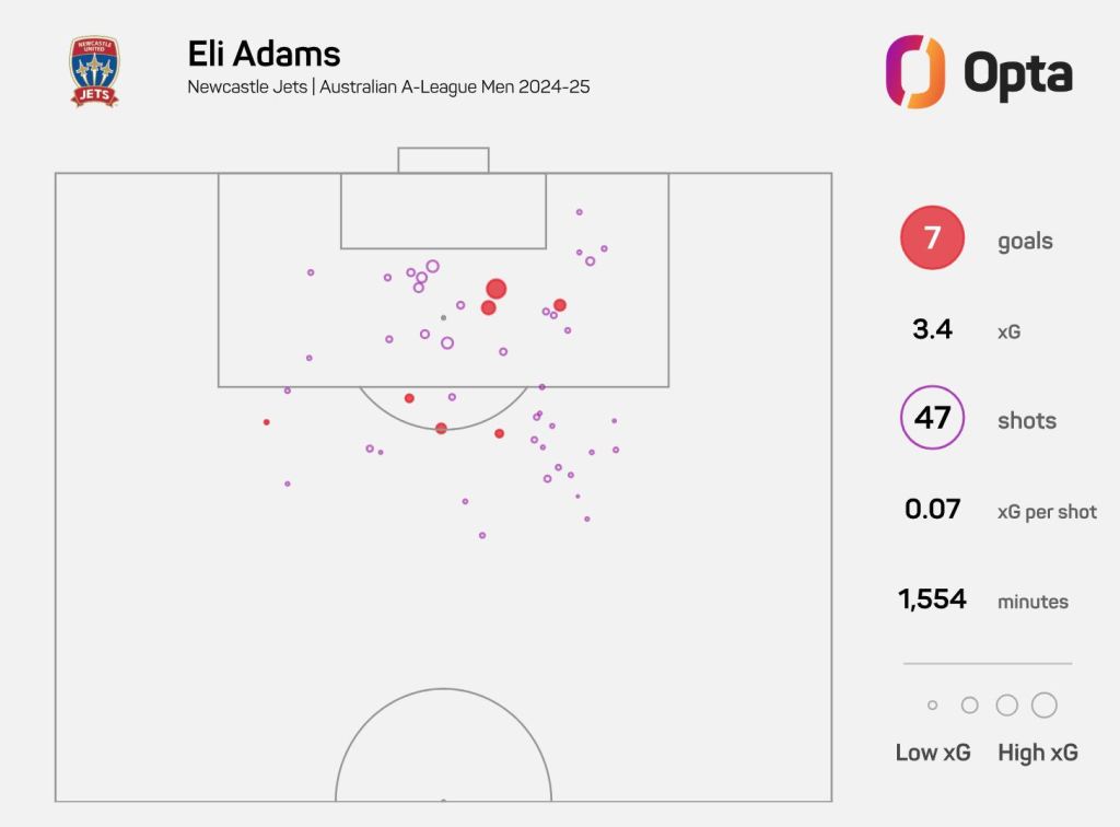 Adams relocated to McDonald Jones Stadium at the beginning of the 2023-24 season, having netted just one goal in a mere 196 minutes of A-League action over his first two seasons.